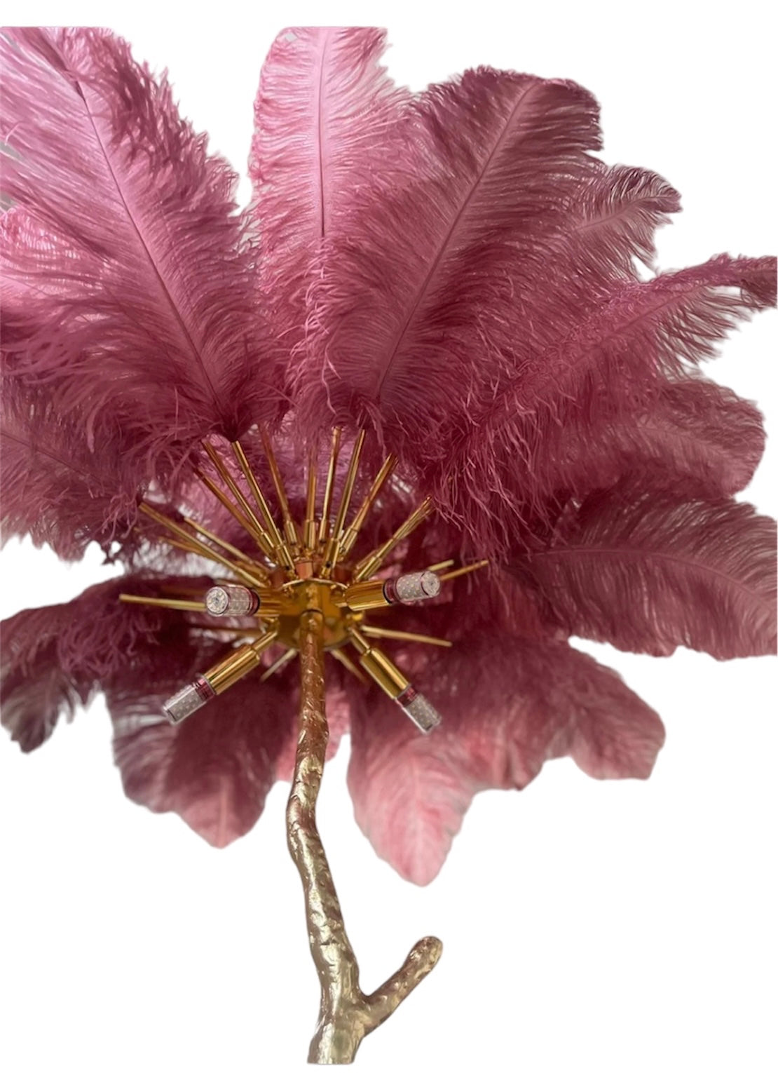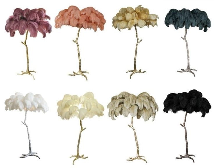 Feather lampen te verkrijgen in de kleuren bruin, zwart, roze. Donker roze, donker blauw en wit, rood, oranje, creme.