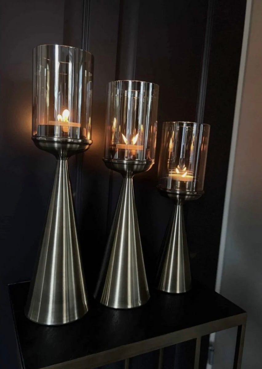 Deze prachtige luxe kandelaars zijn gemaakt van hoogwaardig metaal en champagne kleurig glas waardoor het een luxe en romantische verlichting geeft. de kandelaars zijn te gebruiken als waxinelichthouder of voor stompkaarsen. ze zijn te verkrijgen in 3 verschillende maten en zijn ook leuk te combineren als set!
