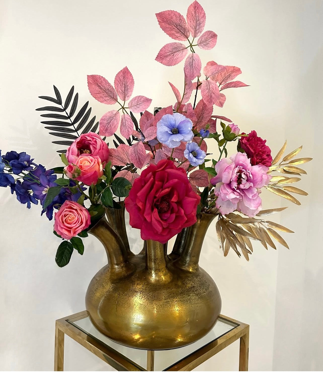 Deze toetervaas gedecoreerd met dit prachtige zijden boeket is een echte eyecatcher voor iedereen interieur!