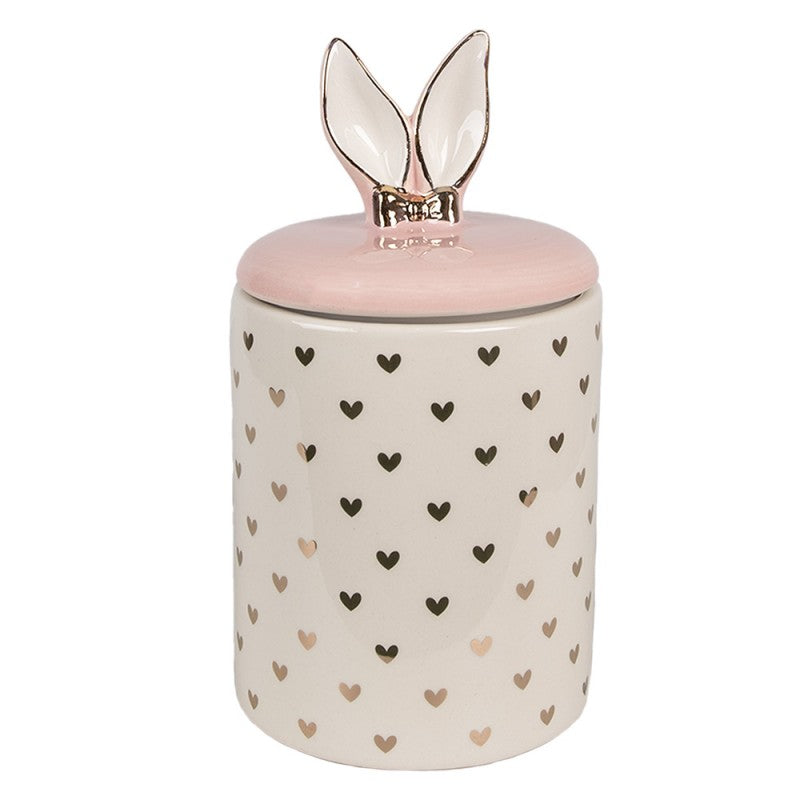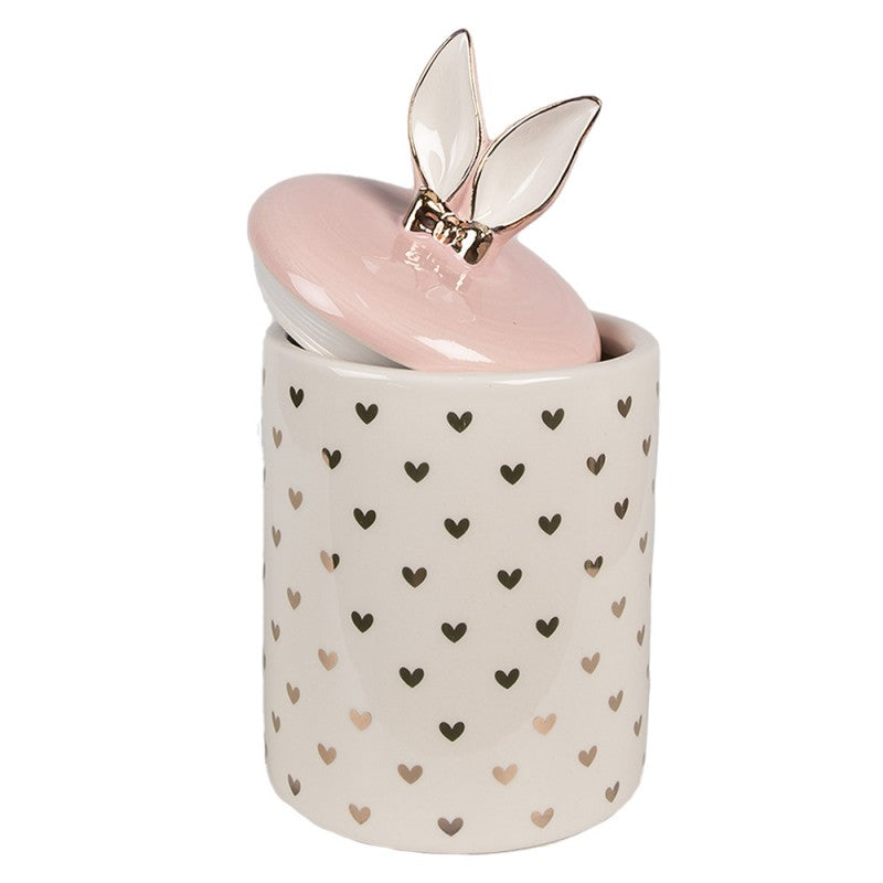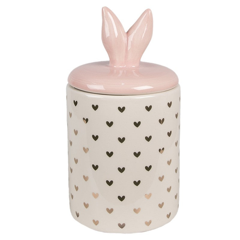 Een charmante opbergpot in pastelkleuren, versierd met hartjes en schattige konijnenoren op het deksel, biedt praktische en esthetische opslag voor kleine items. Een mooi cadeau of stijlvolle paasdecoratie.