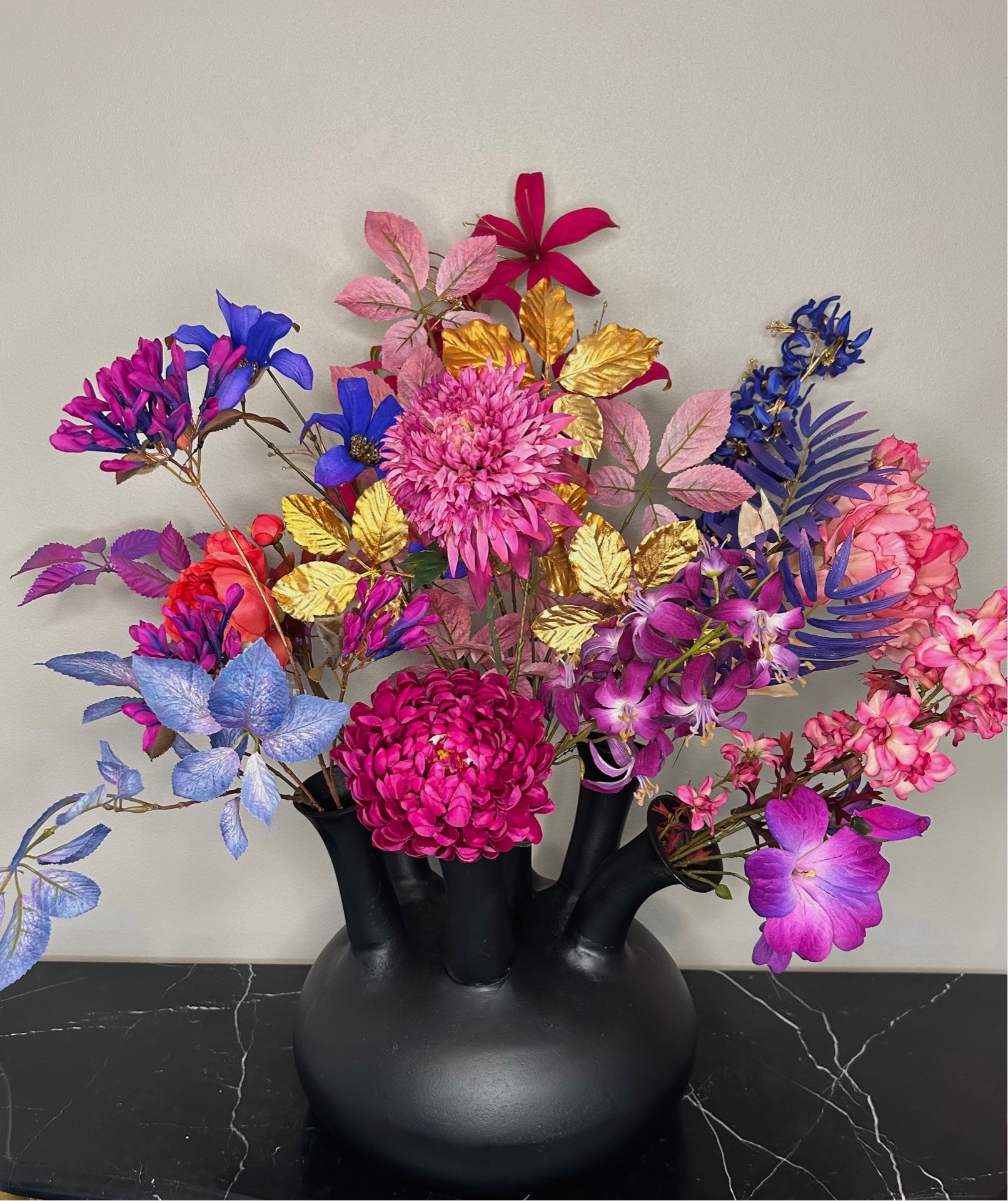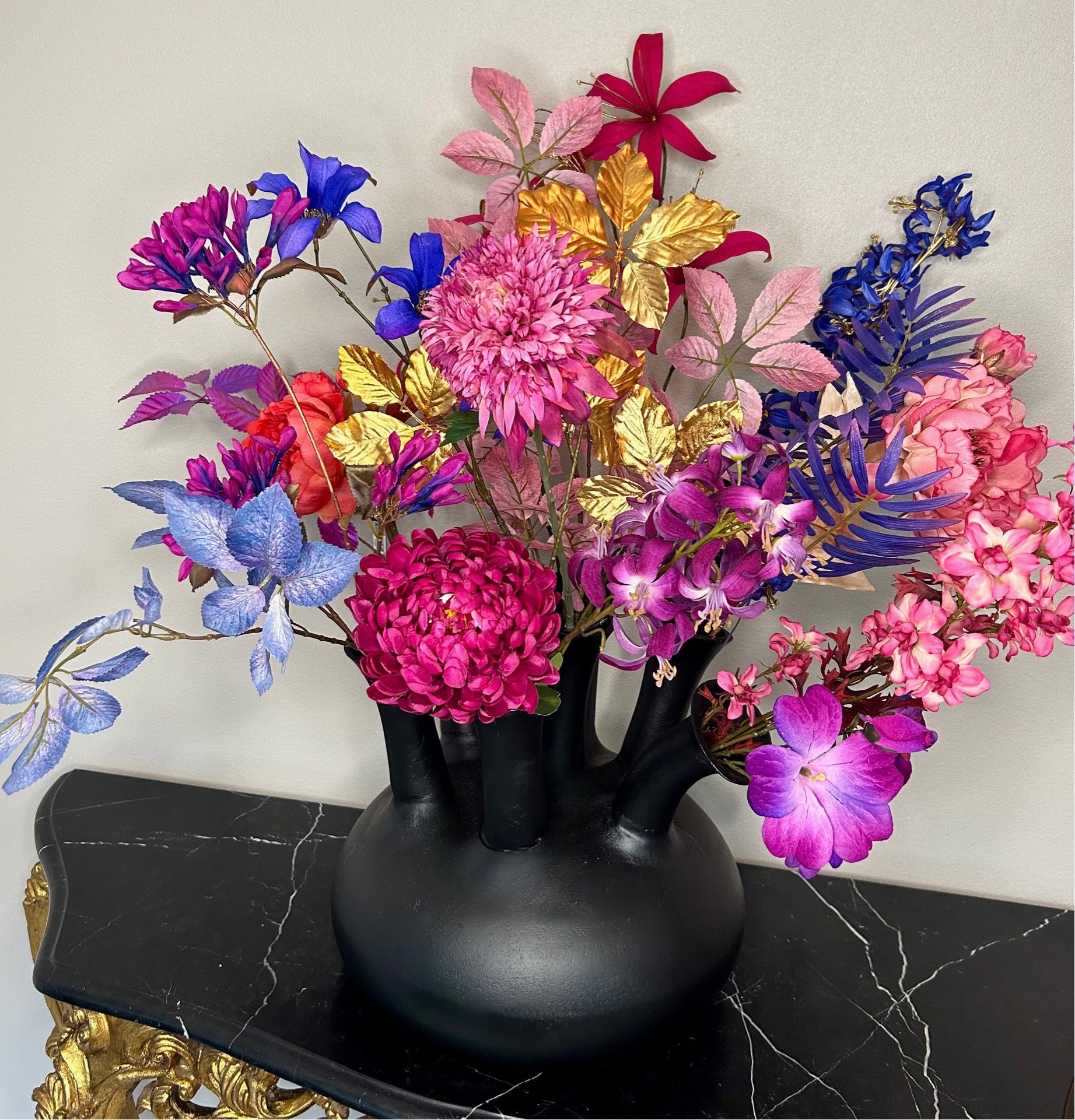 Dit prachtige zijden boeket is gemaakt van zijden bloemen van het merk silkka. Hij is ook mooi te combineren met onze toetervazen!